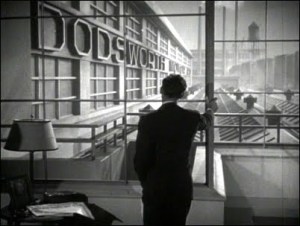 The story is about Sam Dodsworth, an auto tycoon who has just sold the company that bears his name. We first see him as he stands alone in his office looking out over his factory, with a newspaper announcing the sale…and then as he walks through a crowd of employees who offer their thanks and goodbyes. Due to the immense skill of the director William Wyler, we learn a great deal about Sam in these brief, wordless moments. In the first shot, his slightly slumped and motionless posture expresses his regret, and the fact that he has his back to us makes him seem remote and slightly larger than life. His back is still to us in the next scene, but the camera is tracking close behind, so we experience his point of view as the huge group of blue collar auto workers parts slowly and respectfully. We understand that Sam is a good and beloved man, a leader, who is on the cusp of a major life change and full of mixed feelings about it. We like him and identify with him before we’ve even met him.