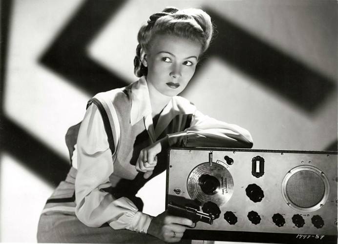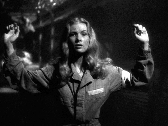 Paramount administered the coup de grace with her next movie: The Hour Before the Dawn. (It’s always the darkest, get it?) She plays a Nazi spy, complete with German accent. Skulking around Franchot Tone’s country estate, making shifty evil eyes with her hair up in braids, she’s borderline ridiculous and saves herself only by staying very still in most of her scenes. An actress with more experience and training, e.g. a less honest one, might have camped her way through this farrago. Lake looks utterly mortified. Her voice is soft and quiet, especially when she murmurs “heil Hitler” after a radio broadcast. I mean: of all the things to make an established, glamorous movie star say at the very height of World War II. In this and her other scenes, she looks like she’s physically restraining herself from running off the set. Can a single movie kill a career? This one did.